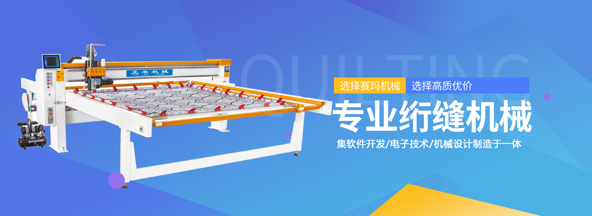 南通赛玛机械有限公司、通州湾示范区正丰绗缝机械厂是生产电脑绗缝机及纺织配套机械设备的专业化生产厂家。销售热线:13862783358,本厂具有独立开发新产品能力,技术力量雄厚,集软件开发,电子技术,机械设计制造于一体。生产工艺和质量居同行业高水平,加工能力强,公司技术人员具有20多年设计、生产、调试的丰富经验。全体员工在吸收日本、韩国等国家产品的优点,结合市场对产品需求的基础上,经过多年不懈的努力,公司产品现已形成电脑多针绗缝机系列、电脑单针绗缝机系列。